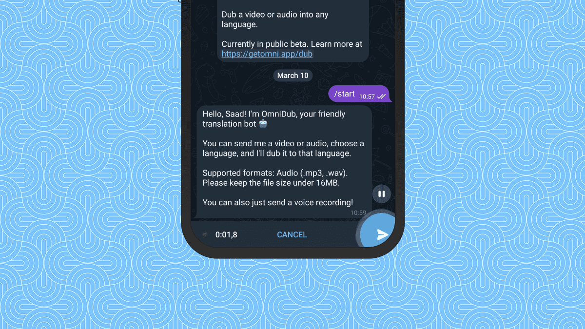 Use the official Telegram bot for quick, on-the-go dubbing for your Telegram DMs.